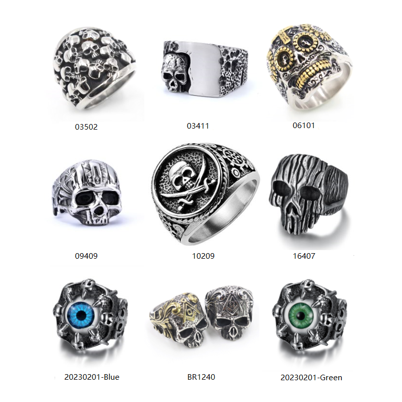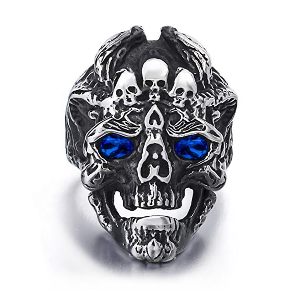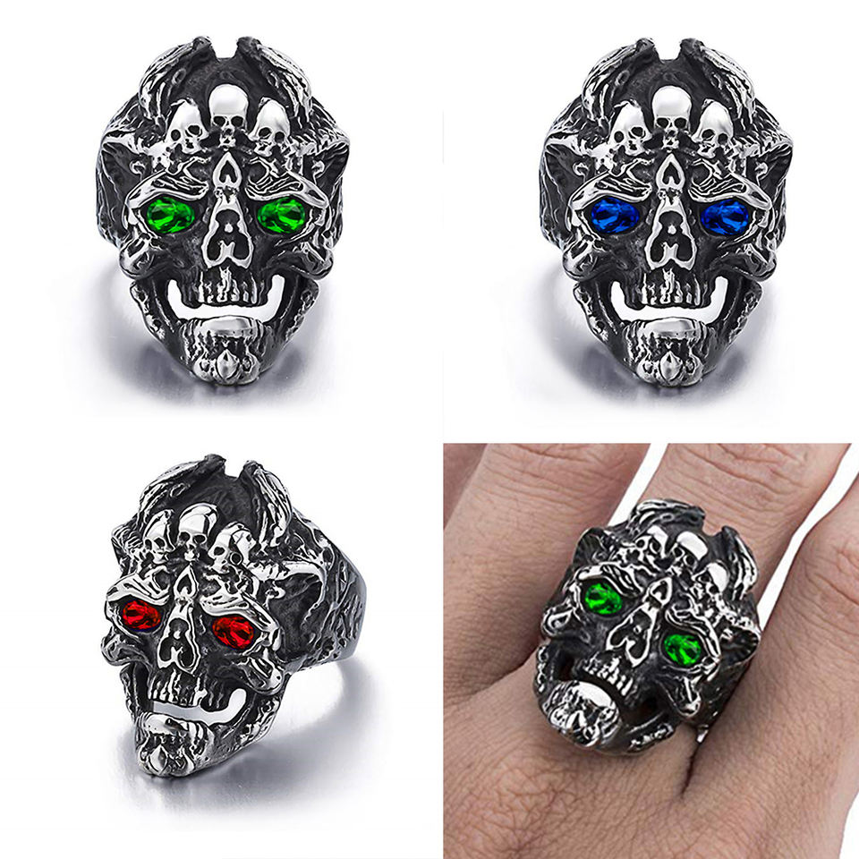 Bague pour homme faite à la main avec incrustations de zircone colorée, bagues en acier en gros pour hommes avec crânes