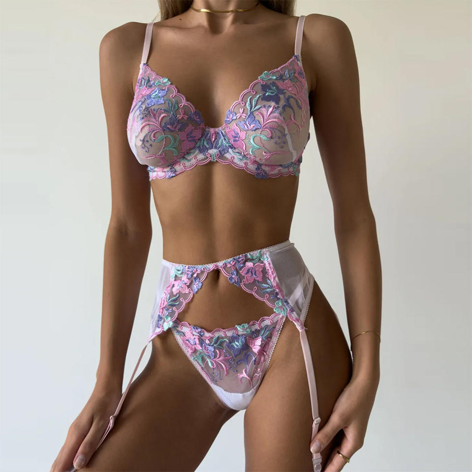 Ensemble 3 pièces de lingerie sexy pour femme en broderie colorée, maille complexe, contraste de couleurs, chiffon froncé