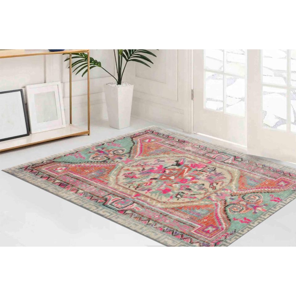 Tapis ethnique coloré : design Oushak délavé, tapis imprimé style turc, tapis en chenille