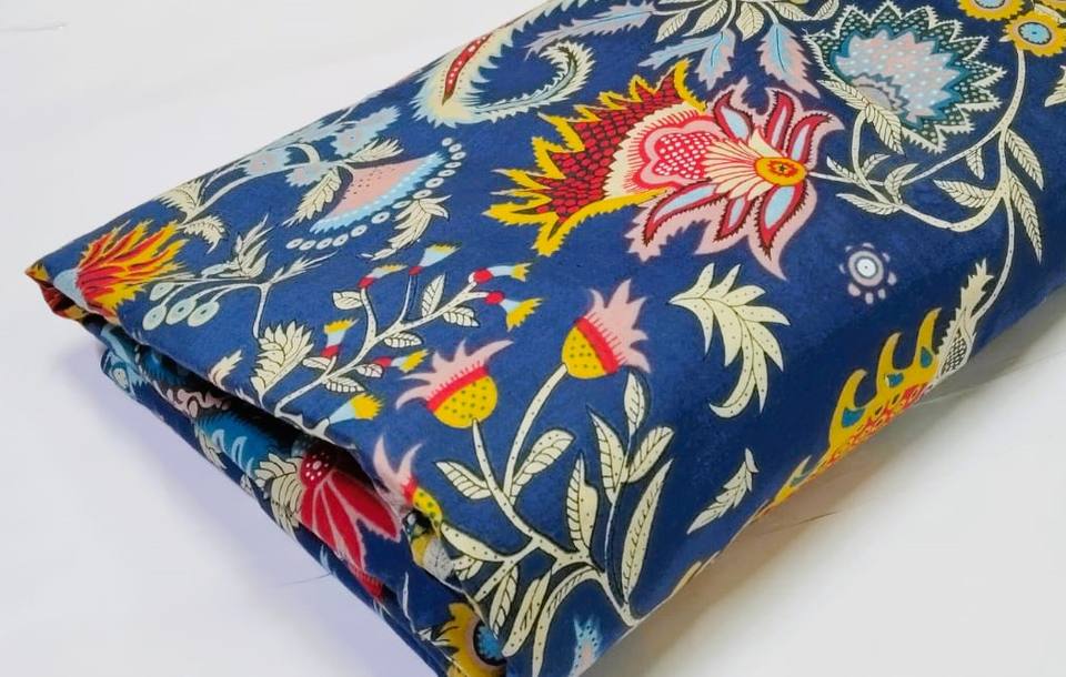 Tissu en coton imprimé floral coloré sur fond bleu pour robes, kimonos, kaftans, kurta – Vente en gros