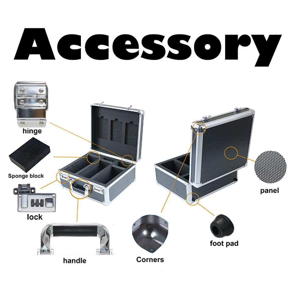 Pièces standard:Couvercle supérieur + couvercle inférieur + deux serrures + une poignée + deux charnières ; Cas vide