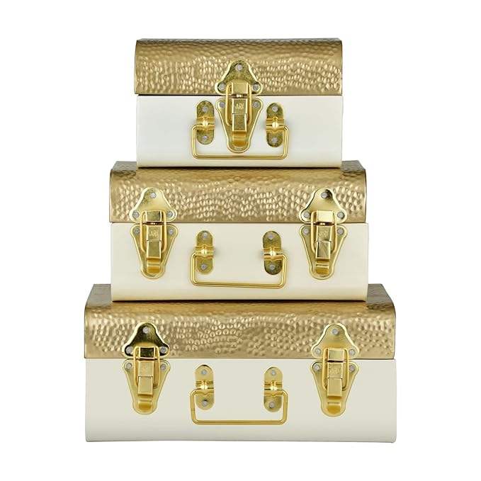 Decorative Aluminum Foldable Hammered Storage Trunks Set of 3 Golden White Rectangular Jewellery Box with Handle