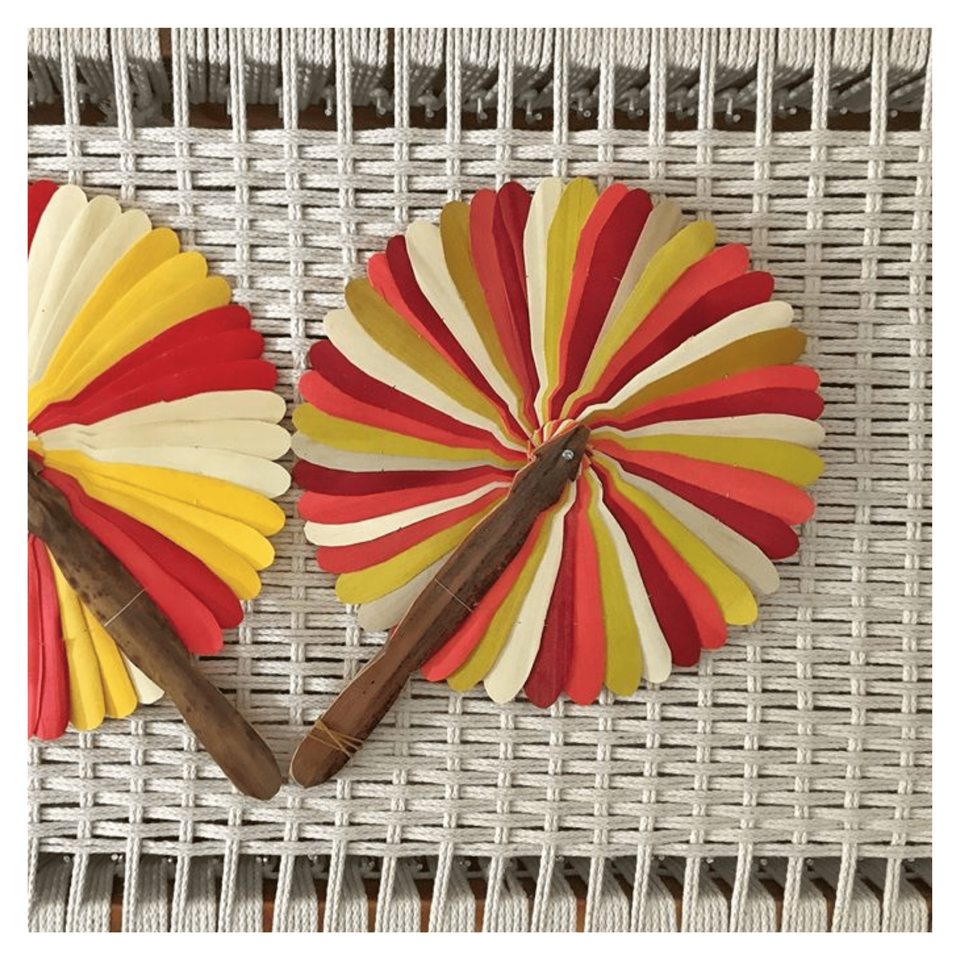 Éventail coloré en feuilles de palmier, fabriqué à partir de feuilles de palmier tissées et de bois de coco, pour un refroidissement portable et une décoration culturelle, Vietnam.