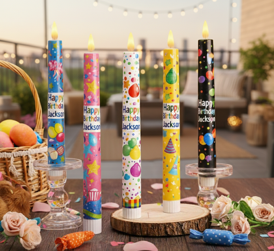 Bougies d'anniversaire personnalisées imprimées colorées pour fêtes, bougies coniques personnalisées avec nom, bougies en cire de soja faites à la main pour mariages et Noël