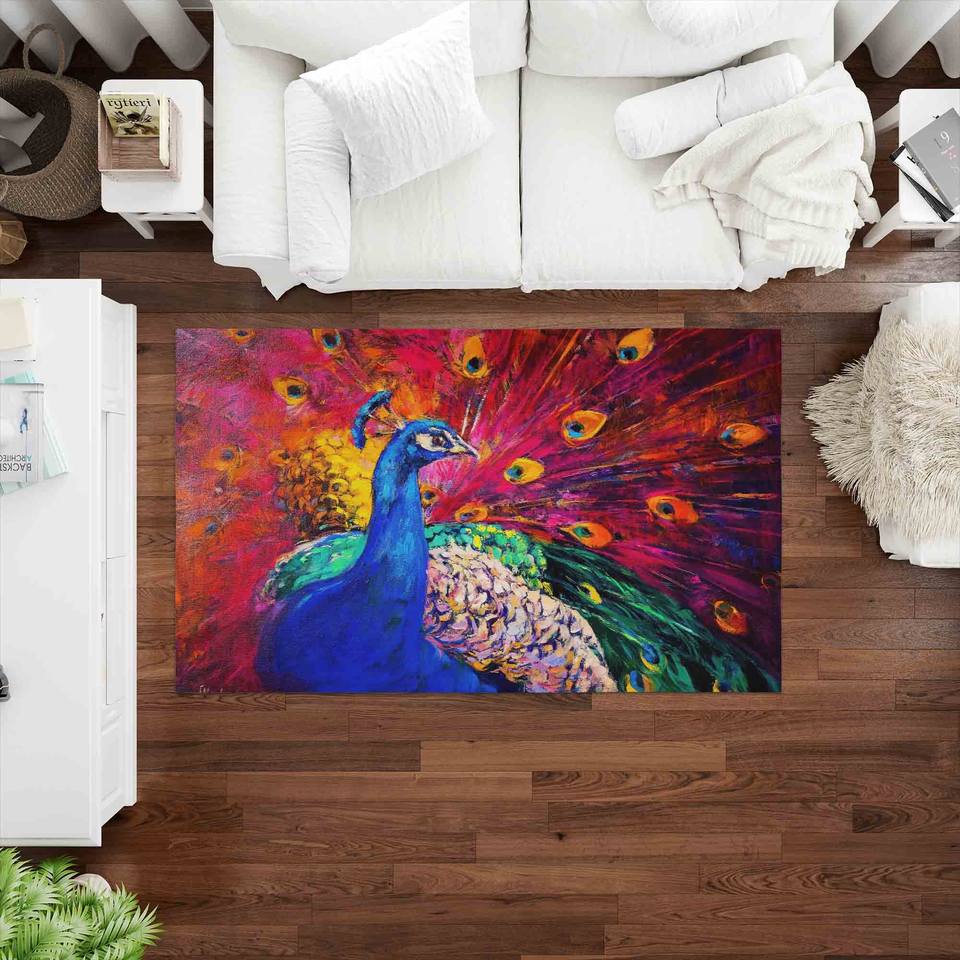 Tapis en laine patchwork imprimé 3D Paon Coloré, écologique, en chenille, pour entrée, avec envers en latex