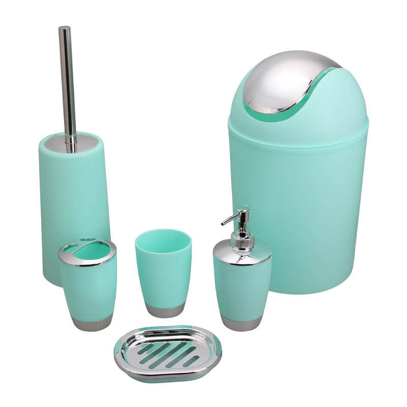 Colorful Plastic Bathroom Set 6 Pcs All in One Washroom Accessory Kit Chrome Plated Pump Waste Bin Toilet Brush Wholesale Bulk