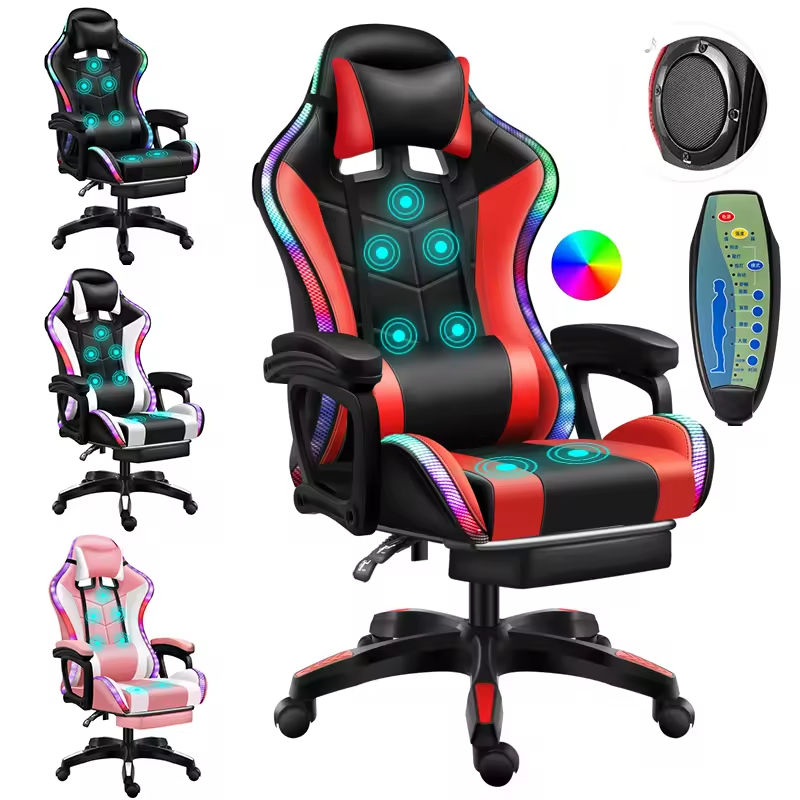 Fauteuil de Gamer Inclinable Coloré en Cuir Rose, Chaise de Course Predator RGB avec Lumières et Haut-parleurs, Fonction Massage