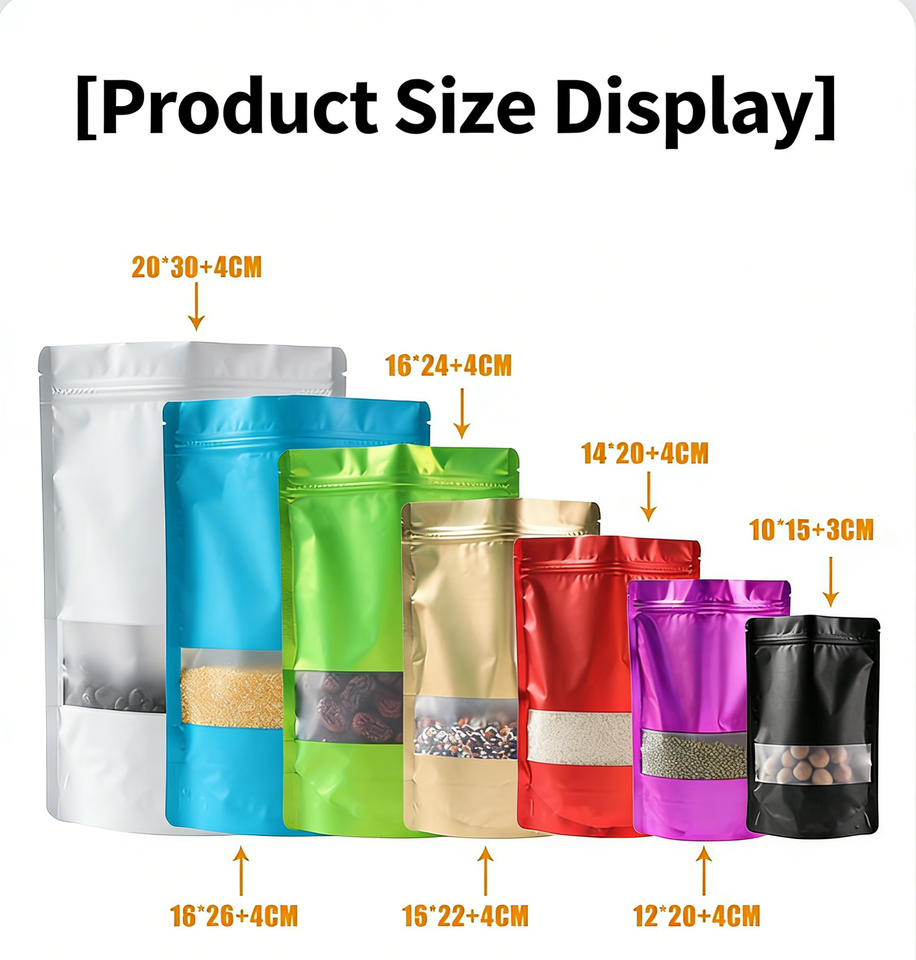 Sachets refermables colorés en aluminium mat avec fenêtre, pour emballage alimentaire