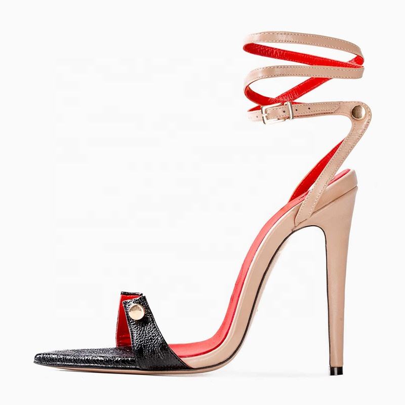Sandales d'été à talons hauts pour femmes, patchwork de couleurs, ornements métalliques, talons fins, escarpins à brides cheville