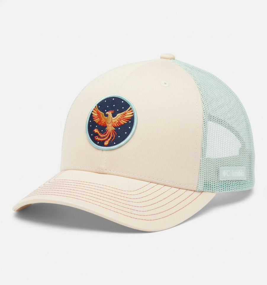 Columbia Brand Beige Trucker Hat with "Explore More" Patch - Perfect for Outdoor & Casual Wear