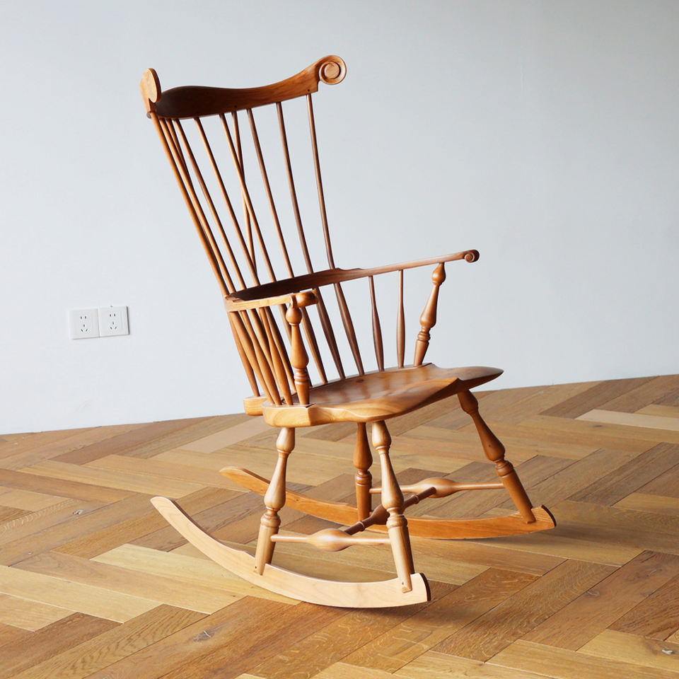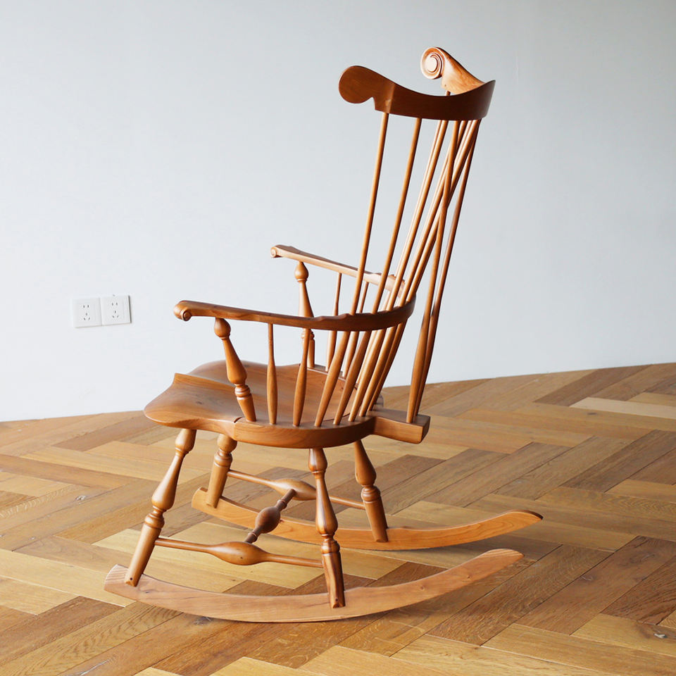 Fauteuil à bascule Windsor en bois massif noyer, style scandinave, avec dossier à lattes et dossier enveloppant, design rétro du milieu du siècle, pour salon et salle à manger