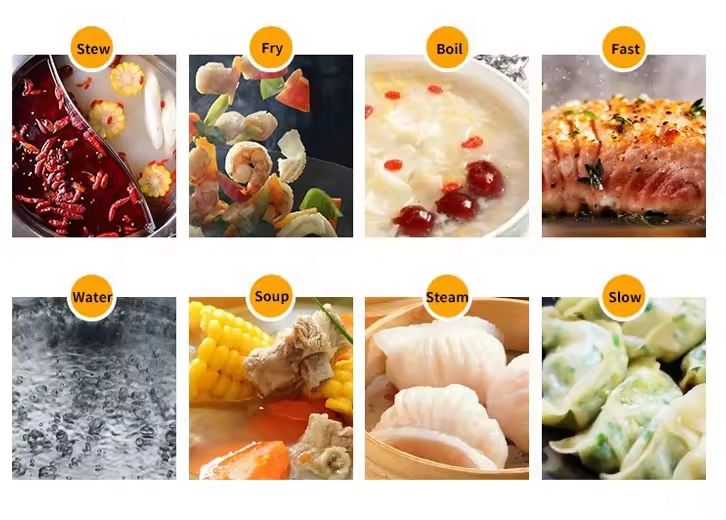 Frire, Ragoût, Intense feu, Ragoût à feux doux, Ragoût au lait, Cuisson de porridge, Soupe ragoût, Vapeur & brouillir, Sauter, Réglage de la température, Bouillissage d'eau