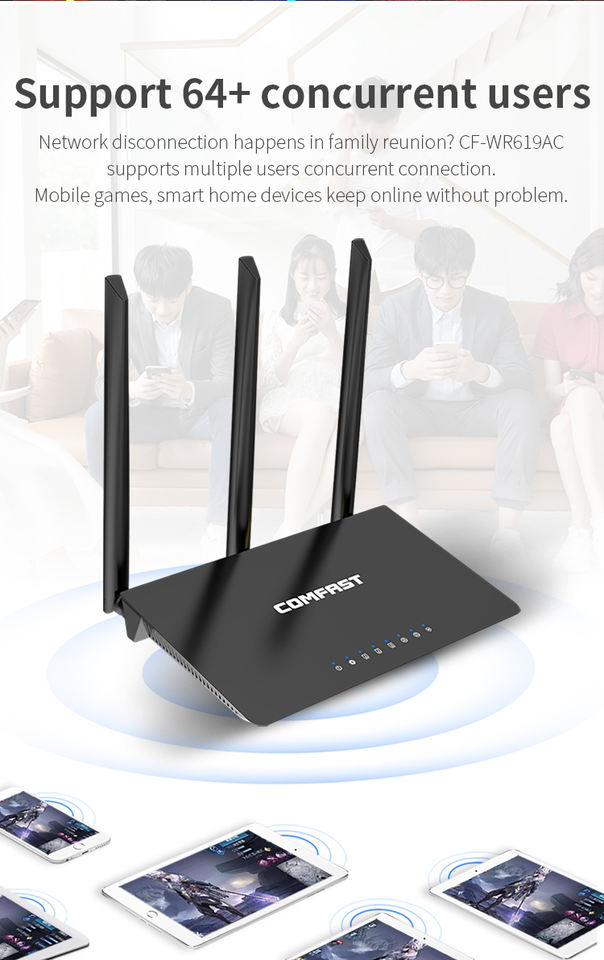 Comfast CF-WR619AC routeur Wifi Gigabit prend en charge 64 utilisateurs prix pas cher AC1200 fonction de pare-feu cryptage WEP 1000mbps Max LAN
