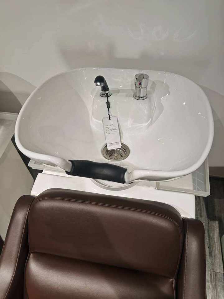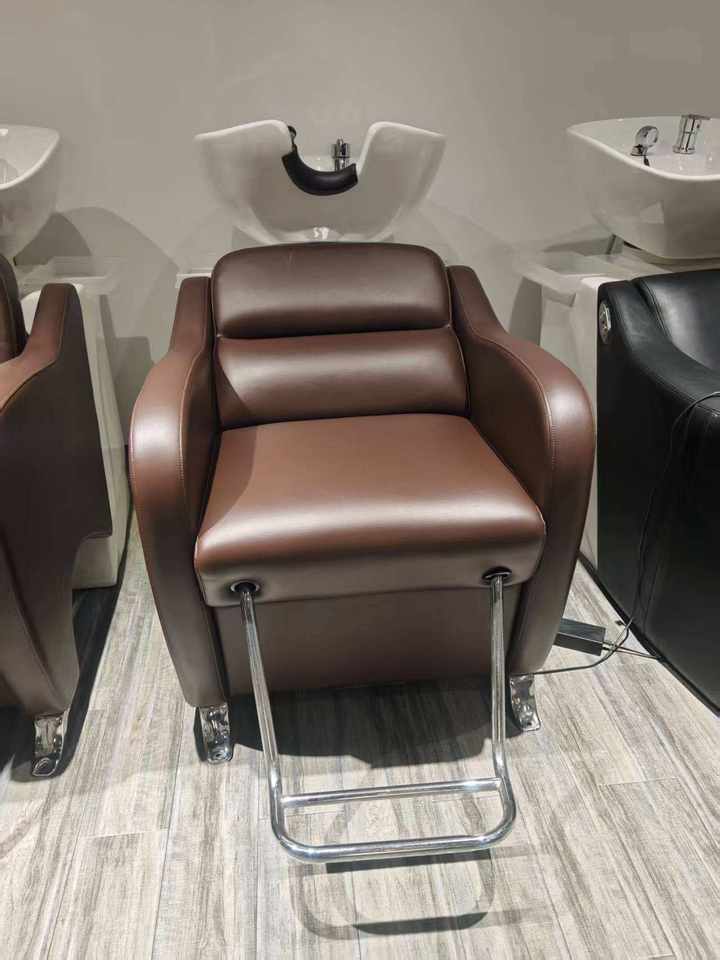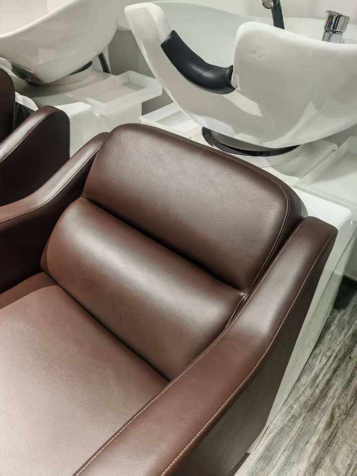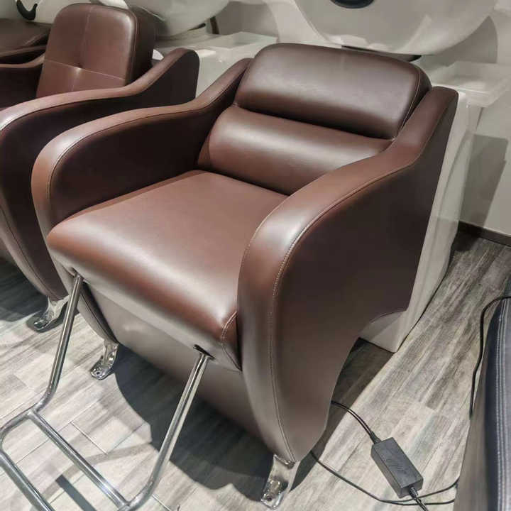 Chaise de lavage confortable pour salon de coiffure, avec bac à shampoing en céramique réglable, cadre en bois moderne, haute densité, pour salons de coiffure et hôtels