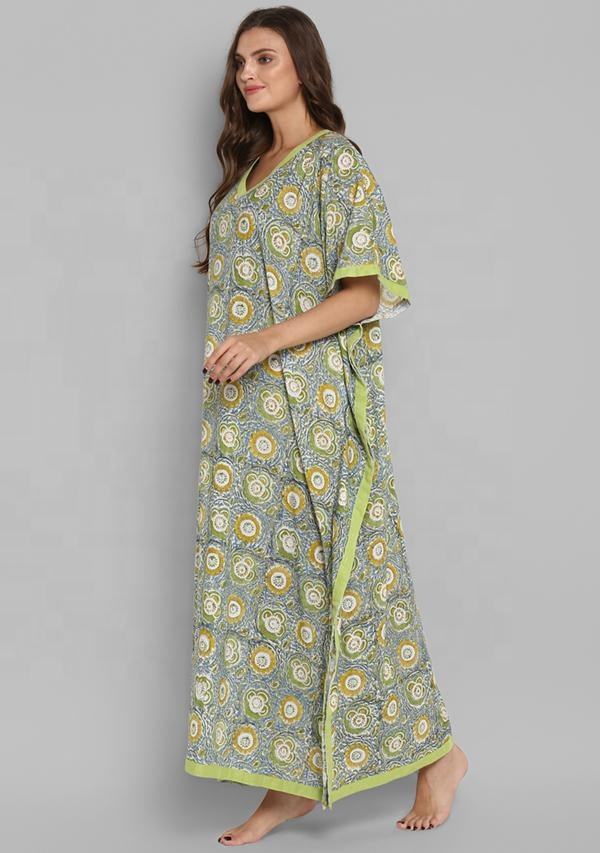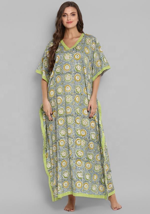 Confortable et chic vert lime jaune bloc de main imprimé décolleté en V et caftan en coton fleuri léger