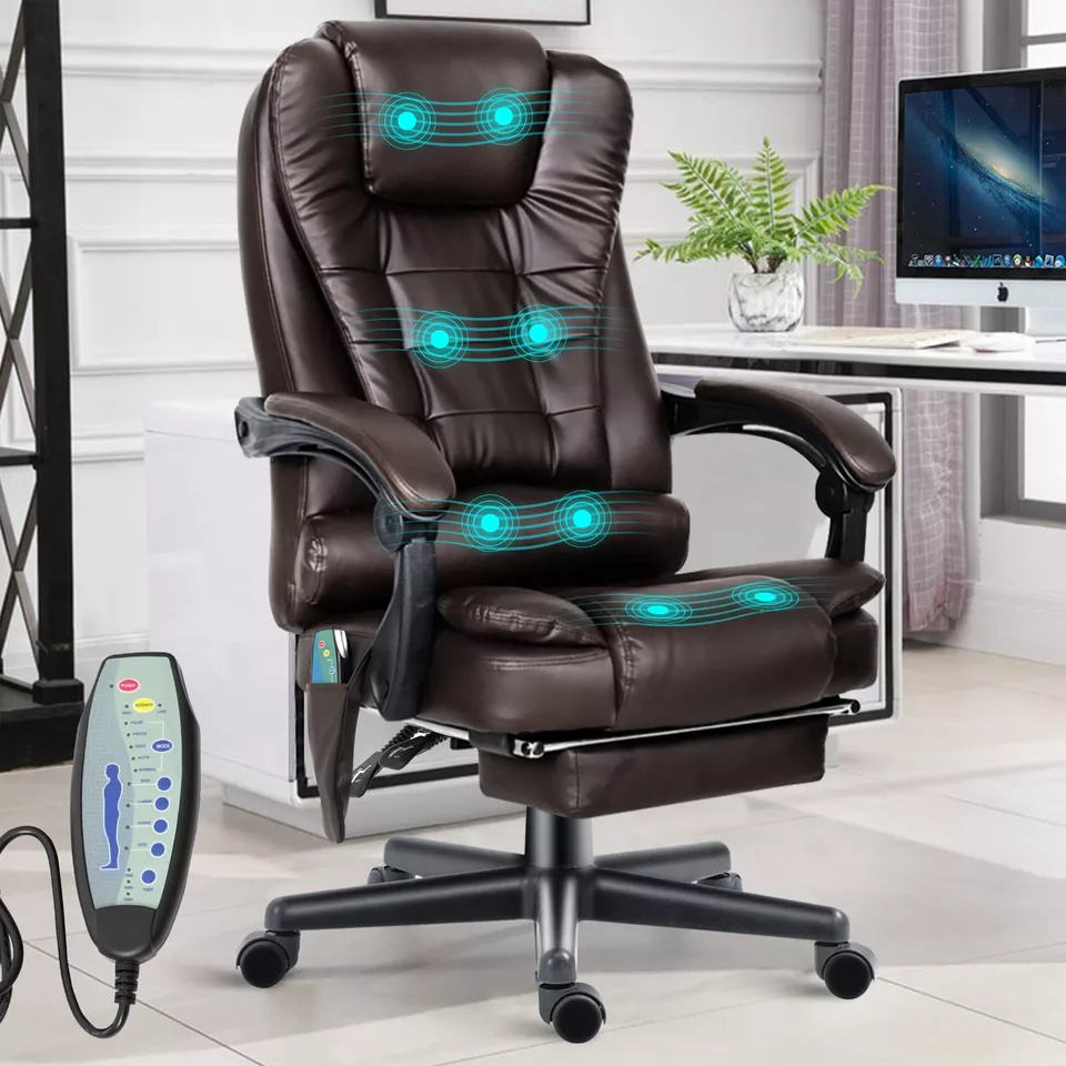 Chaise de bureau de jeu confortable et luxueuse à dossier haut pivotante inclinable en cuir noir avec télécommande de massage et repose-pieds