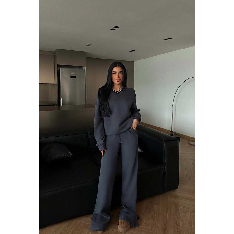 Ensemble de survêtement décontracté gris fumé confortable à col en V, respirant, avec capuche, pour l'automne et l'hiver, idéal pour le jogging, avec logo imprimé
