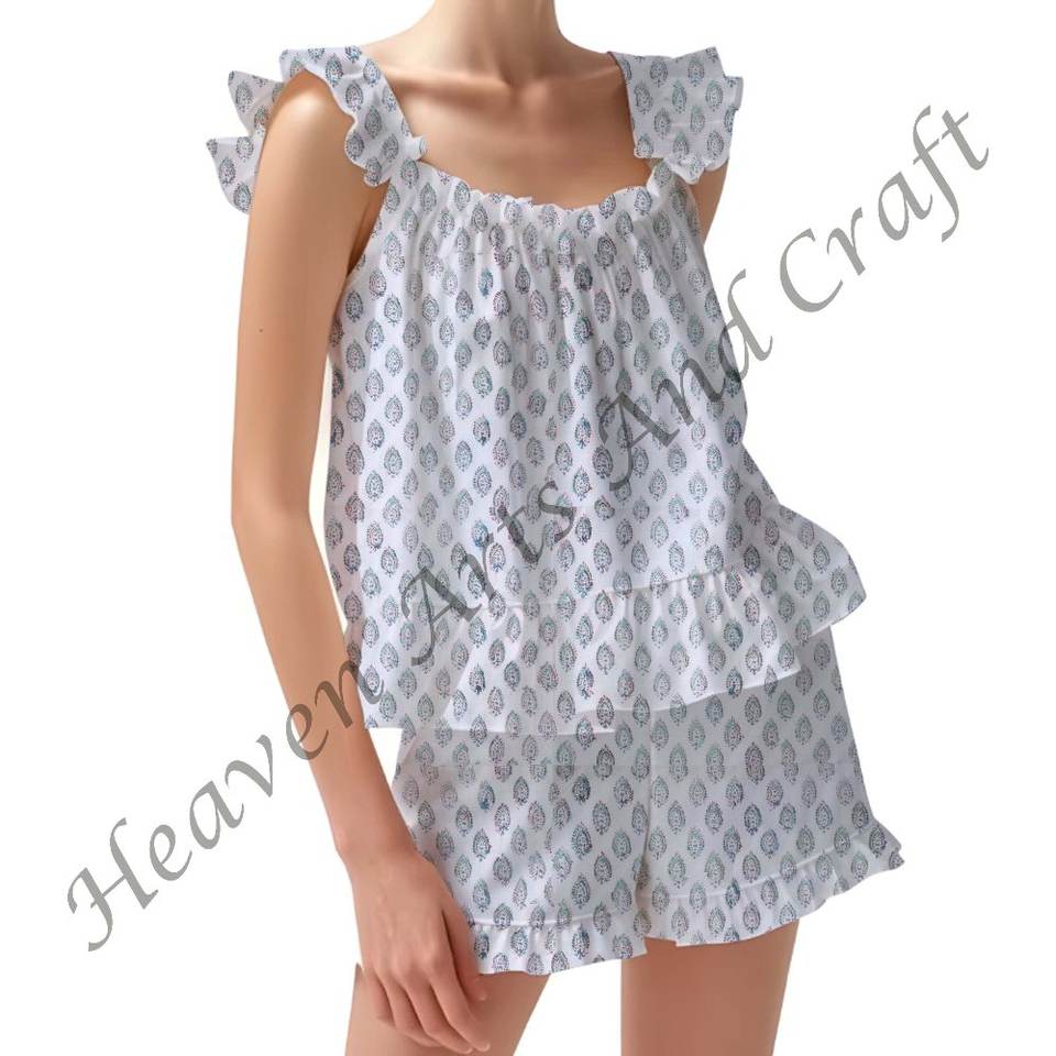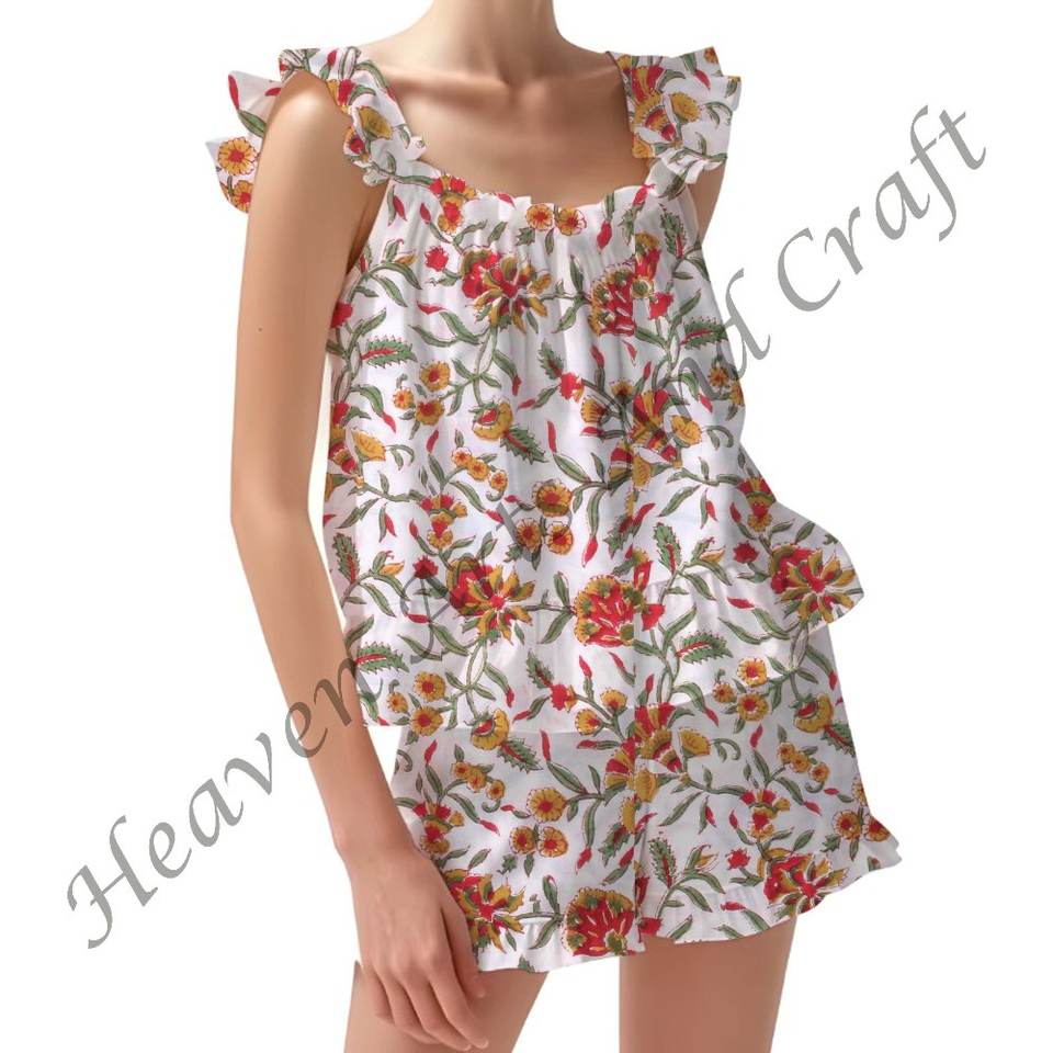 Confortable 100% coton Shorts pyjama ensemble doux indien Floral printemps/été Floral ajusté à bretelles à volants garniture manches PJ ensemble