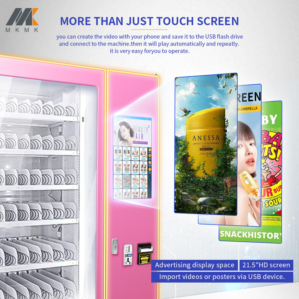 Distributeur automatique commercial 24h/24 en libre-service pour boissons, collations et aliments, accepte les pièces, les billets et les cartes de crédit