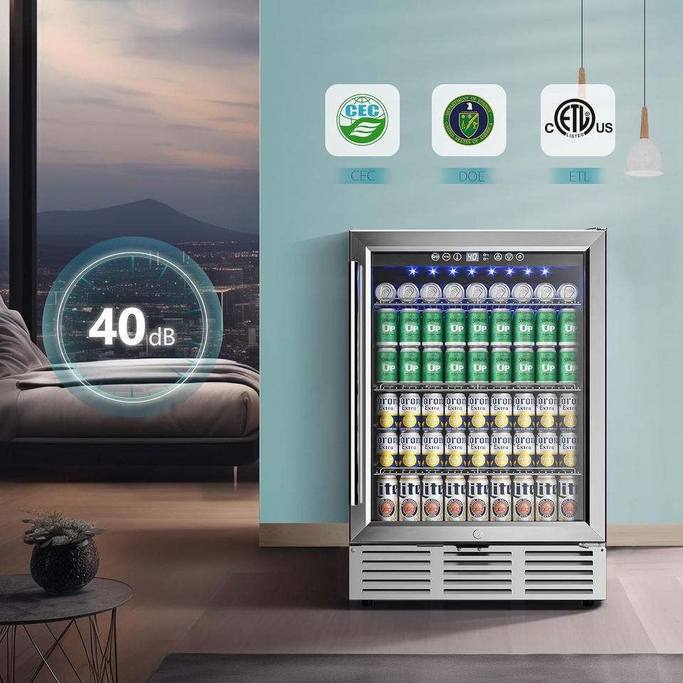 Réfrigérateur-congélateur compact professionnel encastrable en acier inoxydable à double zone avec portes vitrées pour boissons, idéal pour hôtels