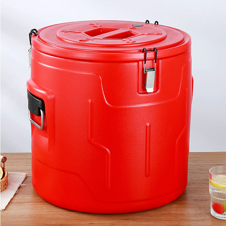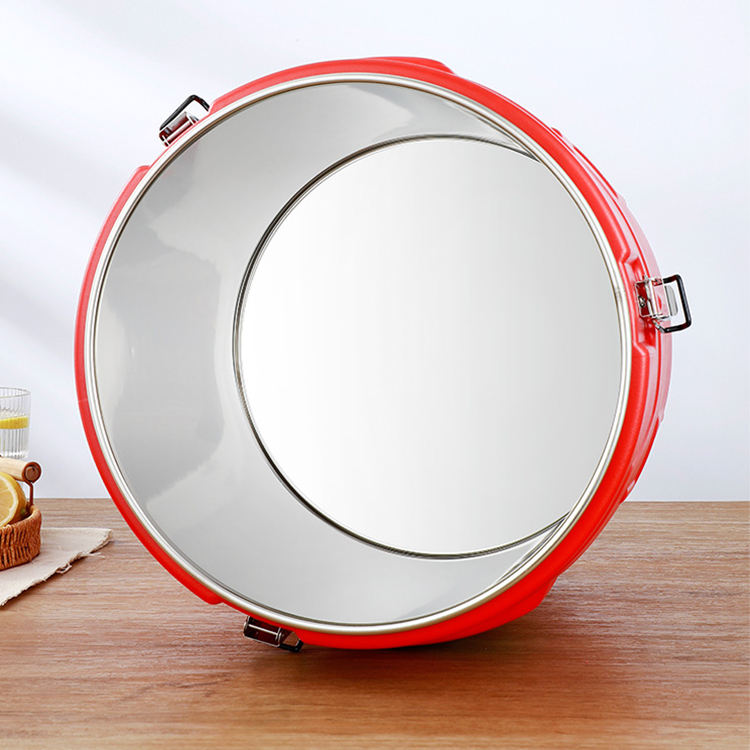 Baril de transport alimentaire isotherme rond en acier inoxydable rouge grande capacité pour la restauration commerciale