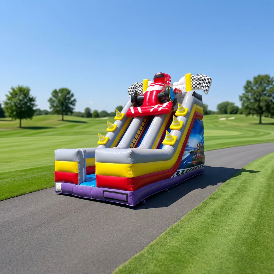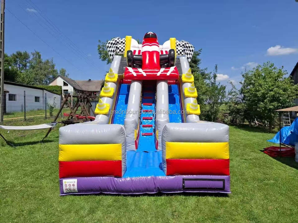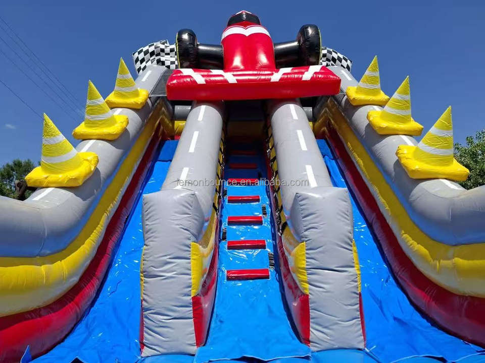 Structure gonflable commerciale à double piste avec toboggan et mur d'escalade, idéale pour les fêtes en extérieur et la location de jeux pour enfants