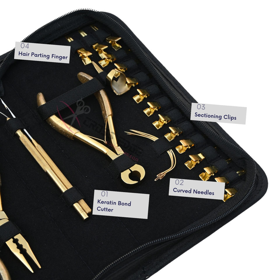 Nom du produit:Ensemble d'outils pour extensions de cheveux dorées avec pince à sertir pour micro-anneaux