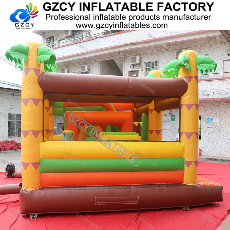 Château gonflable de qualité commerciale pour fête tropicale sur la plage, colonnes de palmiers, design de sable ondulé, matériau PVC pour enfants en plein air