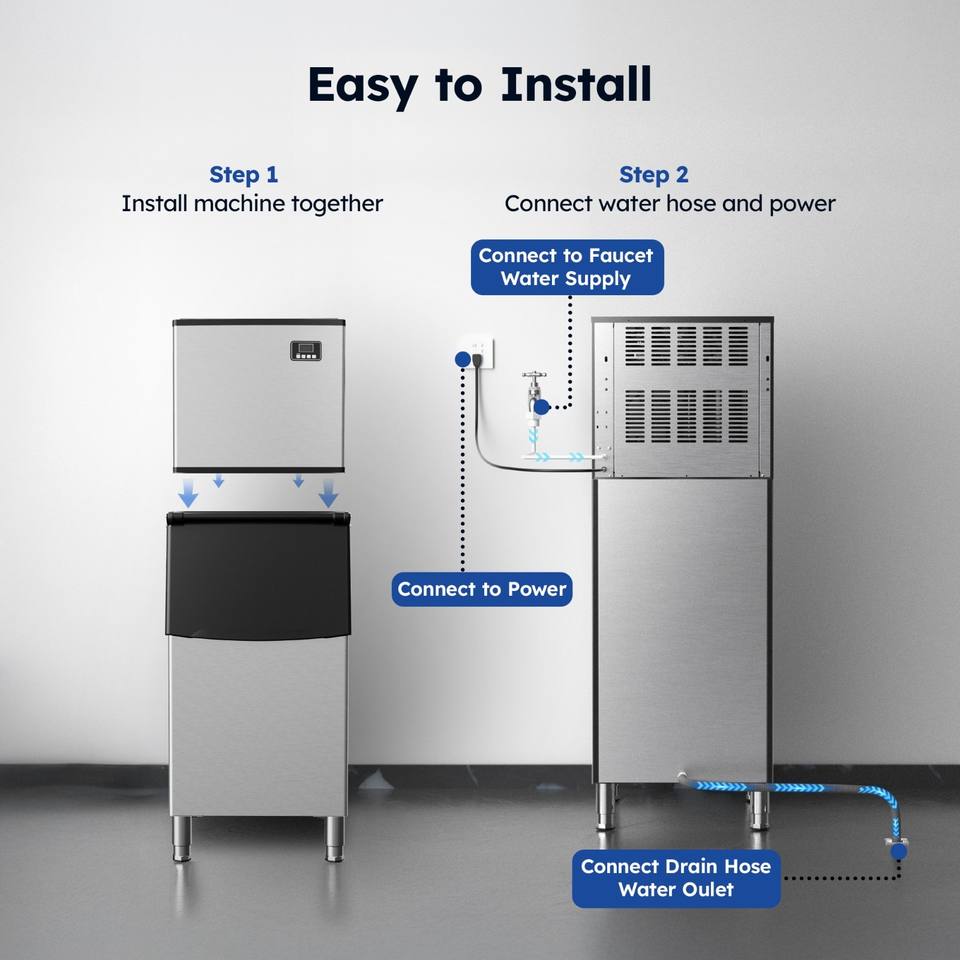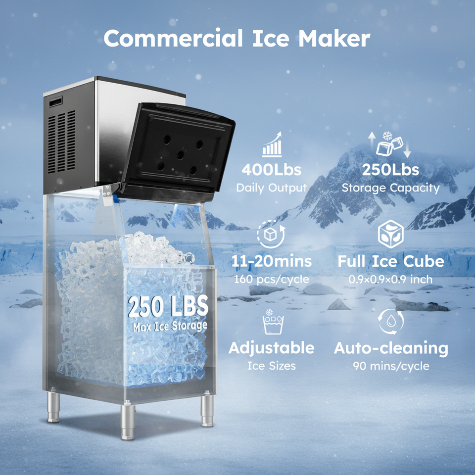Machine à glaçons commerciale 400 lb/24h en acier inoxydable avec stockage de 250 lb, nettoyage automatique, glaçons rapides en 11-20 min