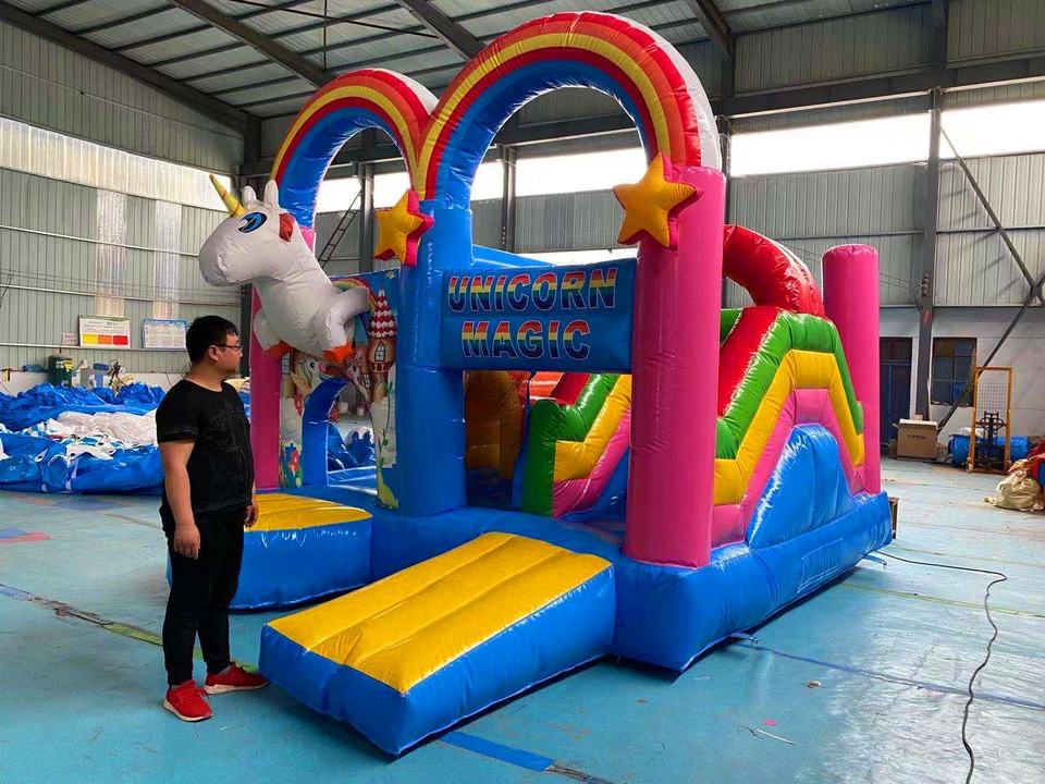 Château Gonflable Licorne Commercial Combo avec Toboggan, Rainbow Bouncy Jumper pour Location Fêtes Enfants