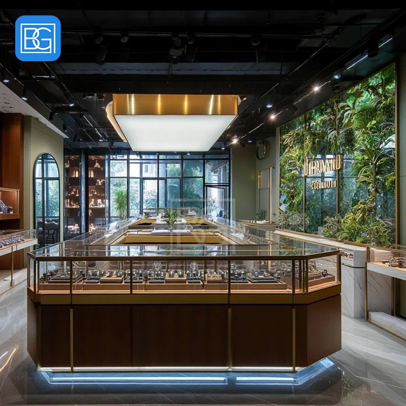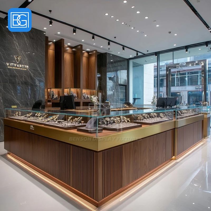Vitrine de présentation de bijoux commerciale, cadre métallique, présentoir de vente au détail, espace commercial, vitrine de luxe pour bijouterie