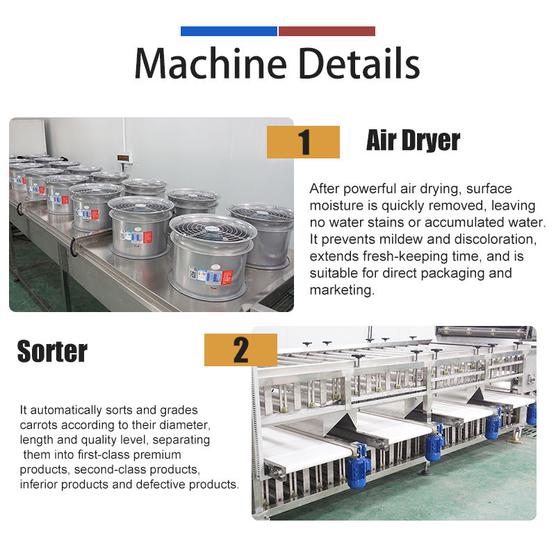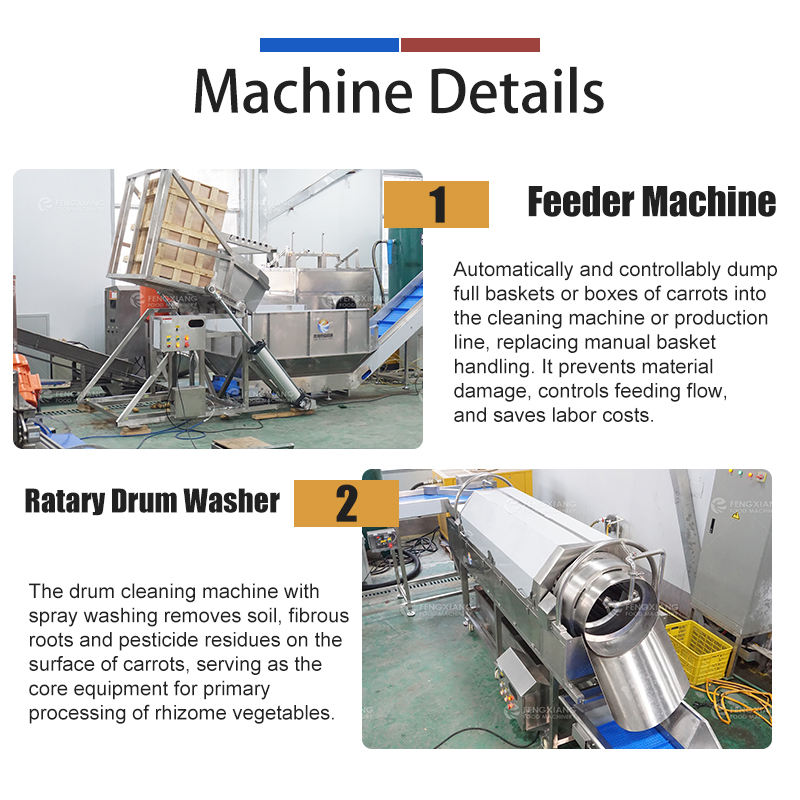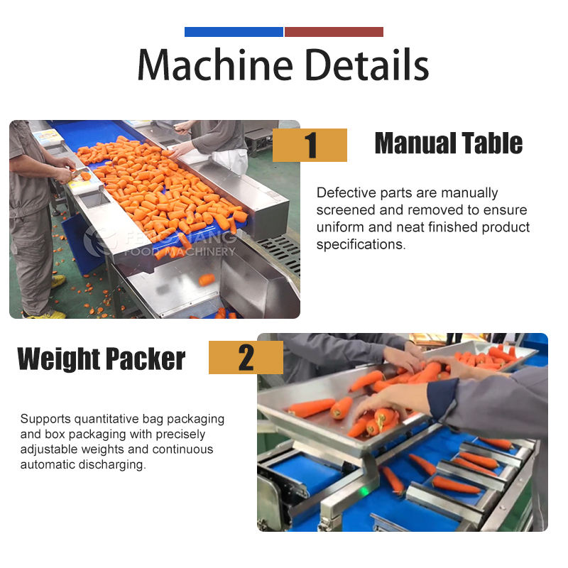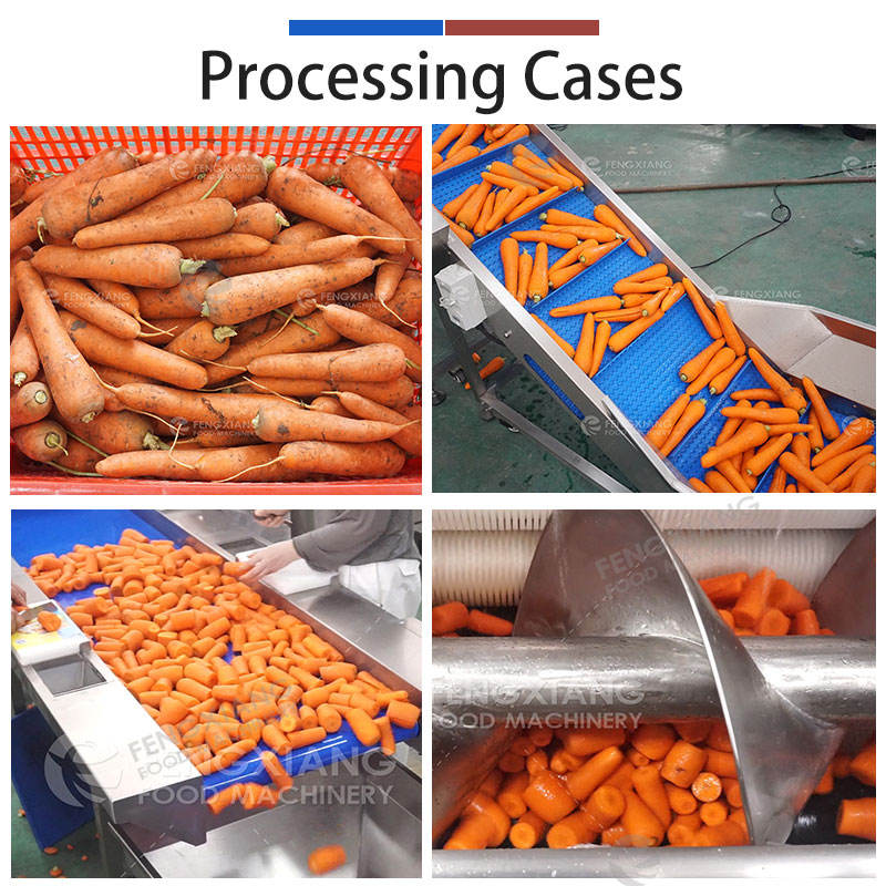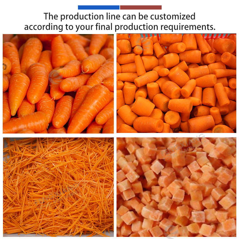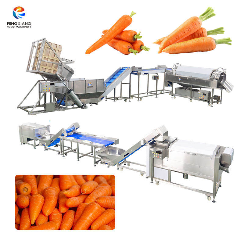 Ligne de traitement commerciale pour radis et carottes : Alimentateur, Laveuse, Éplucheuse, Coupeuse, Machine d'emballage pondéral pour radis