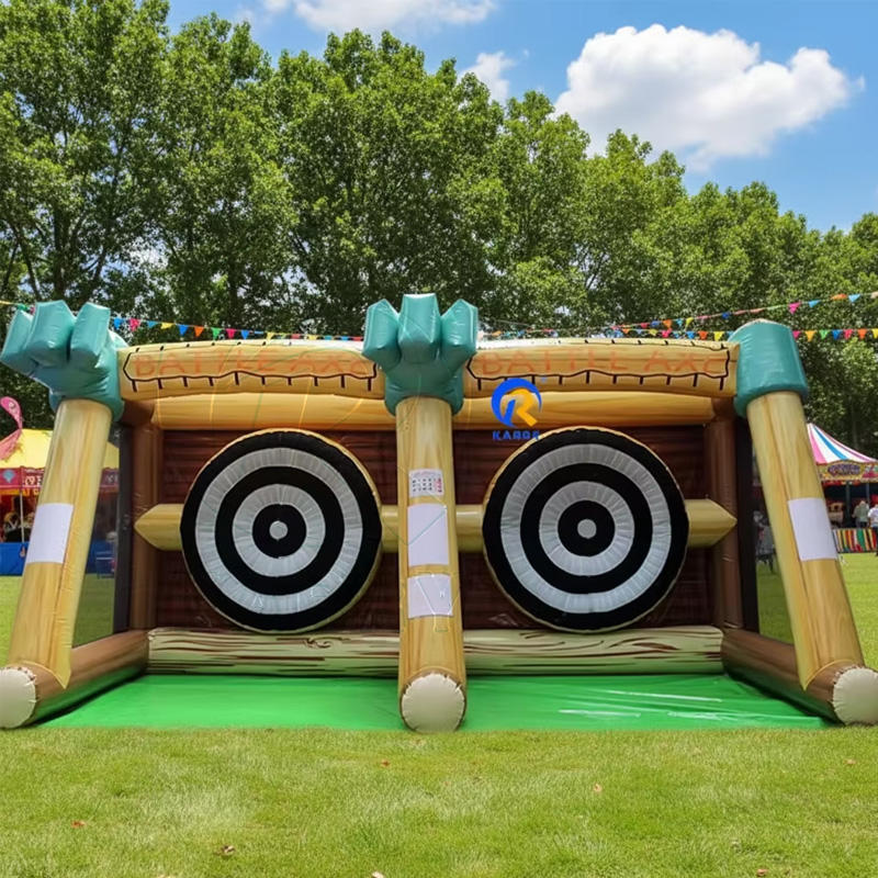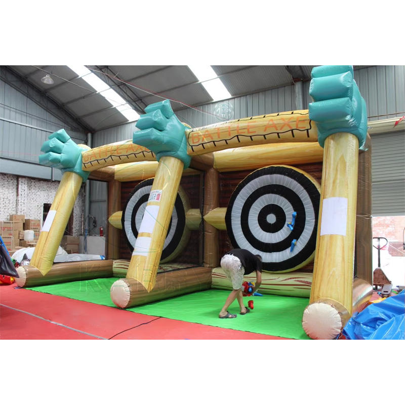Jeu de fléchettes gonflable commercial avec design de cabane en bois et mains vertes animées pour les fêtes foraines et les divertissements en plein air