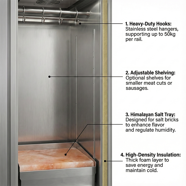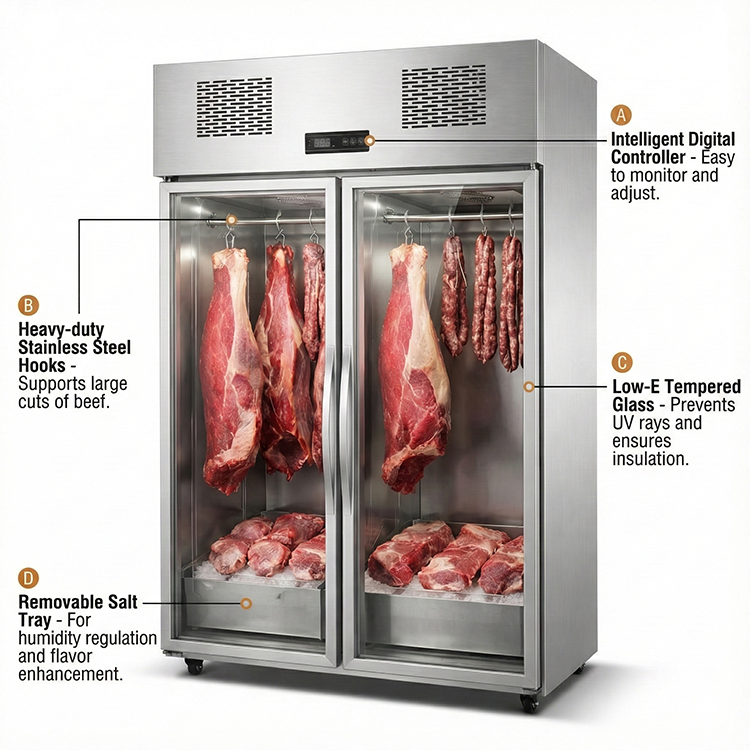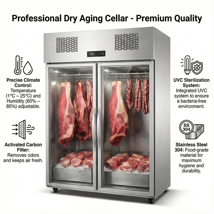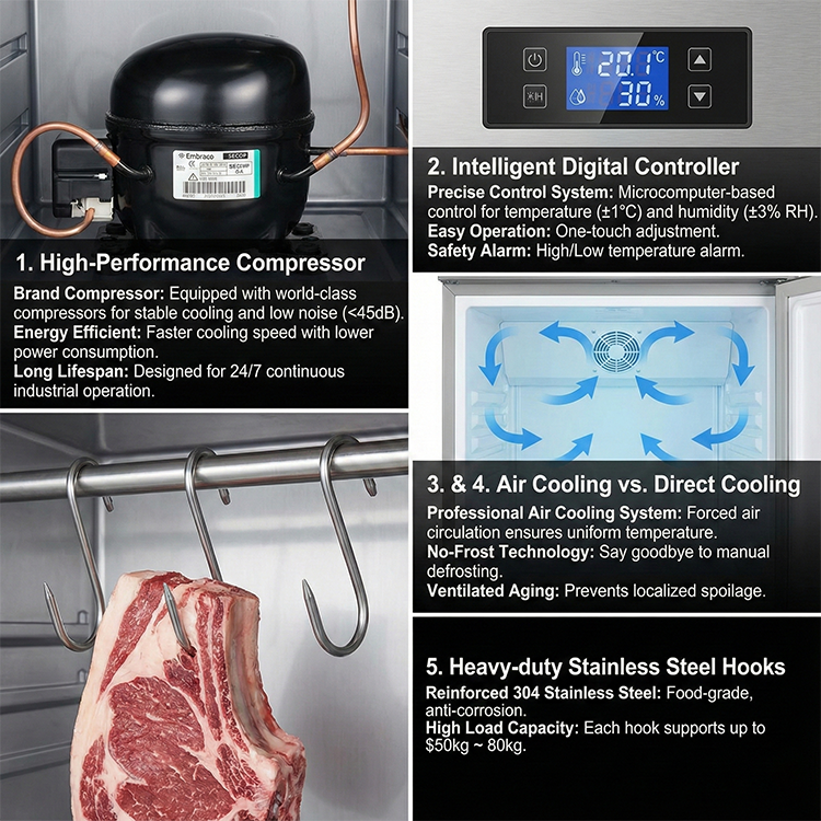 Vitrine réfrigérée verticale pour la viande, conception suspendue, équipement de réfrigération, congélateur de présentation de viande fraîche et sécurisée