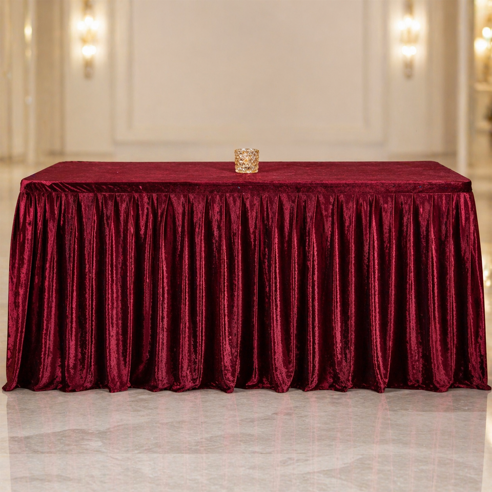 Nappe en velours lavable pour usage commercial avec jupe à volants, tissu personnalisé pour la restauration fine et les événements professionnels