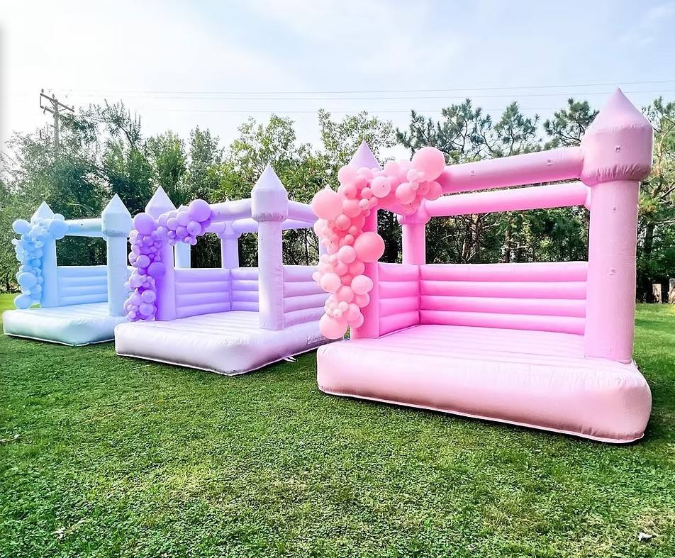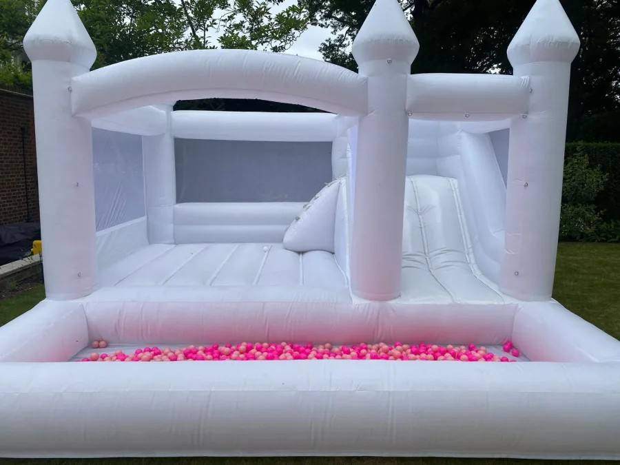 Château gonflable commercial blanc avec toboggan et piscine à balles, structure de jeu tout-en-un pour événements