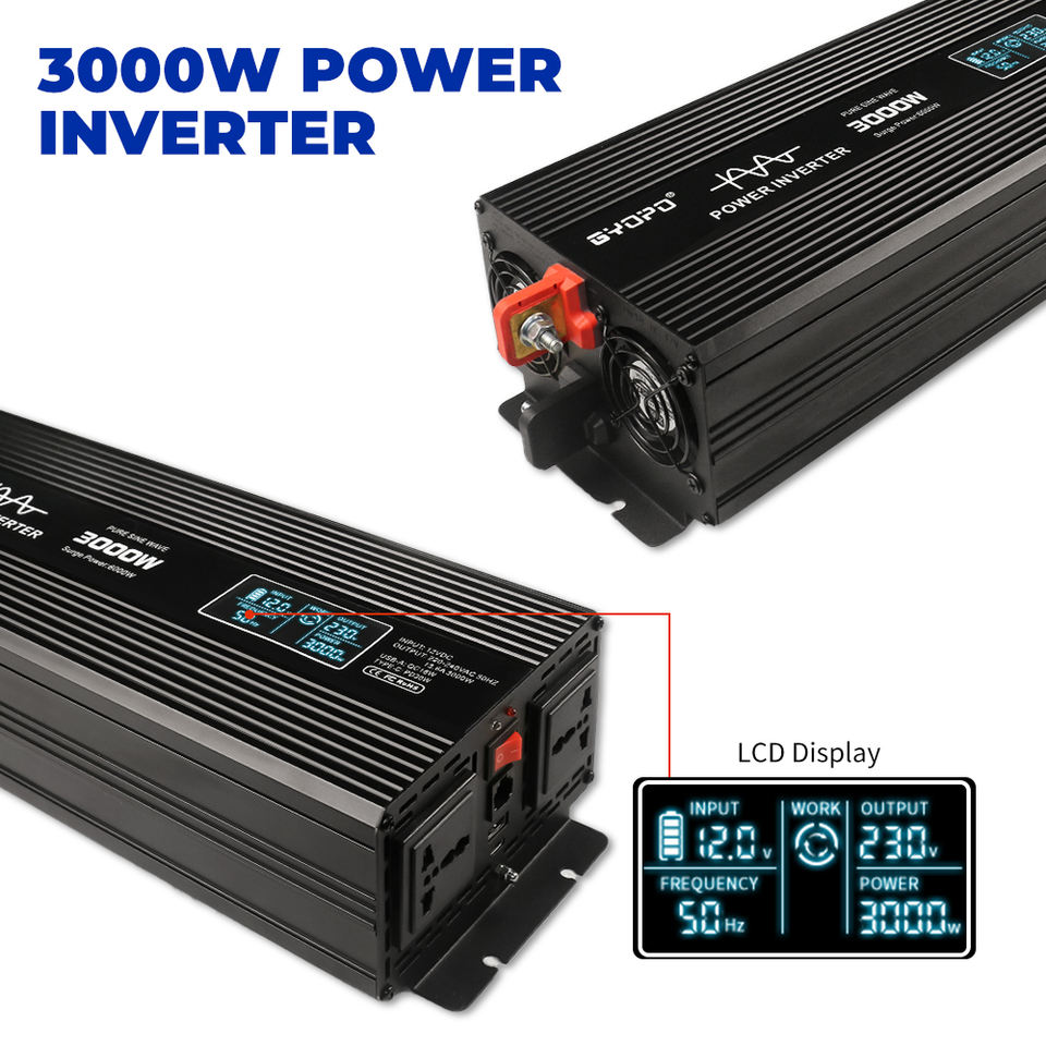 Convertisseur d'onduleur à onde sinusoïdale pure compact 12V vers 220V à double sortie 3000W pour voiture, camping-car, bateau, utilisation domestique