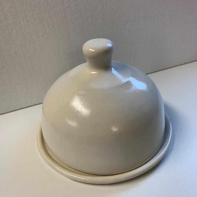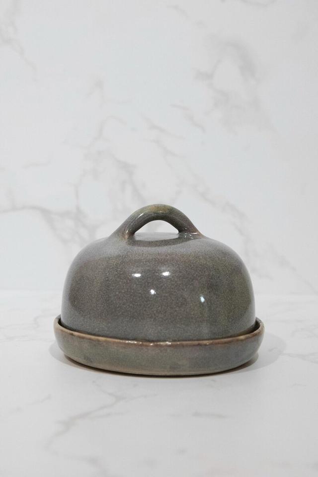 Pot à beurre compact en forme de dôme avec couvercle à poignée, finition brillante, base ronde élégante pour comptoir de cuisine