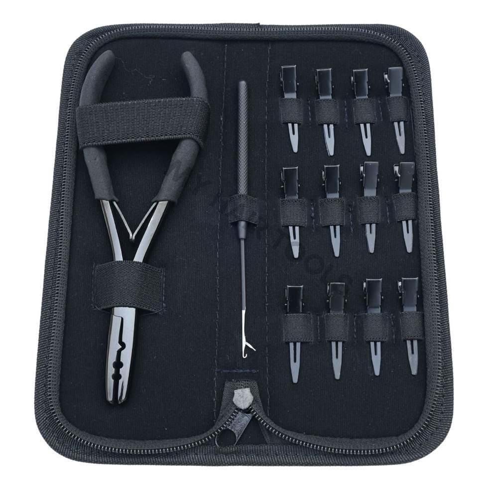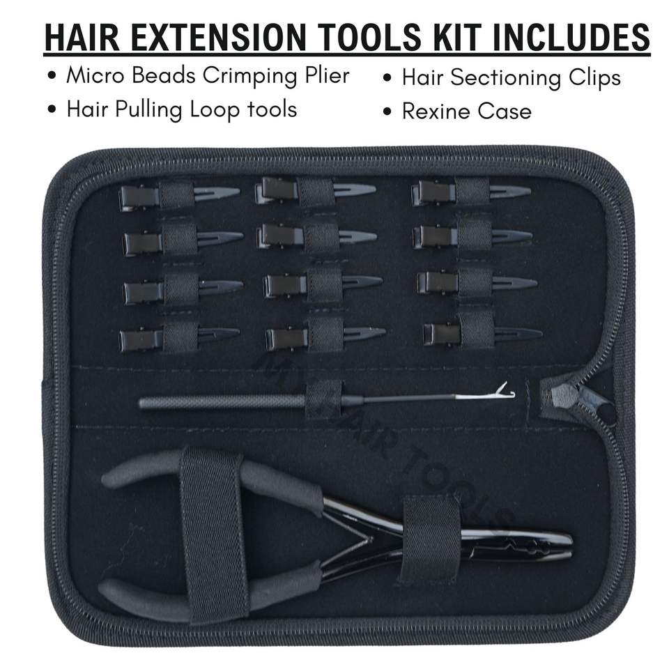 Kit d'outils compacts pour extensions de cheveux avec pinces à micro-perles, pinces à boucles pour tirer les cheveux, pinces de sectionnement, emballé dans un étui à outils en Rexine
