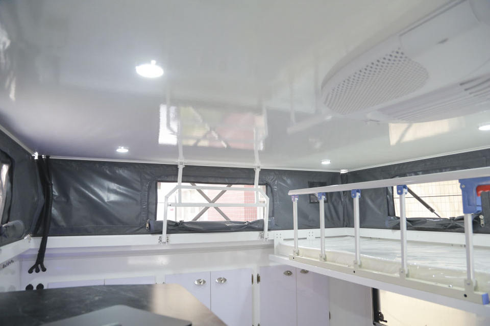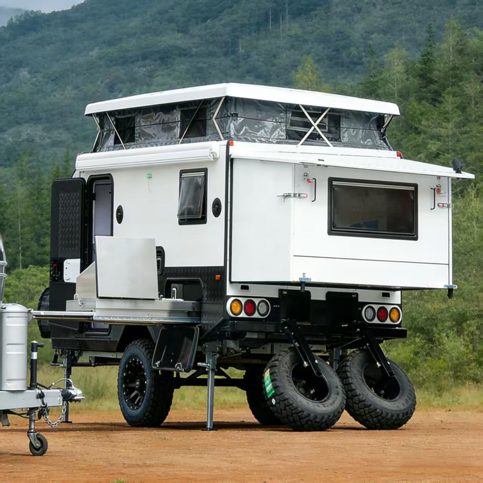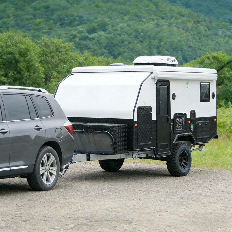 Caravane compacte tout-terrain avec douche, cuisine et panneau solaire, remorque de camping légère remorquable par SUV pour le camping