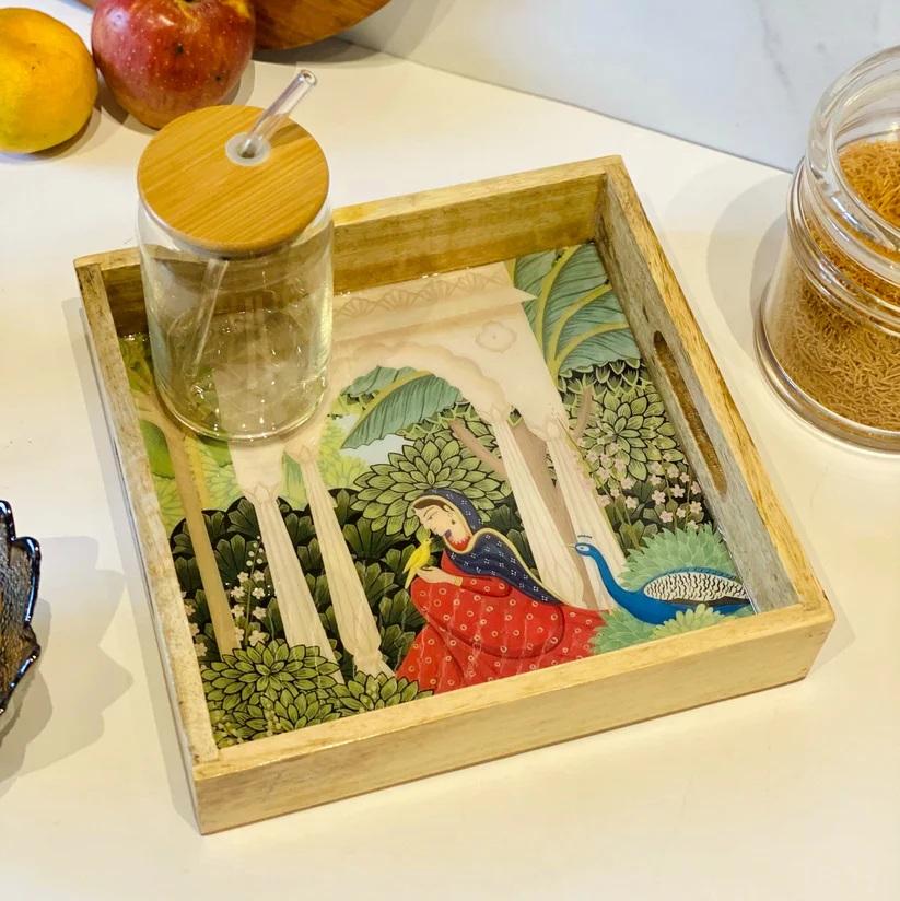 Plateau de service carré compact en bois, magnifique plateau en bois artisanal imprimé bleu design pour commandes en gros et cadeaux