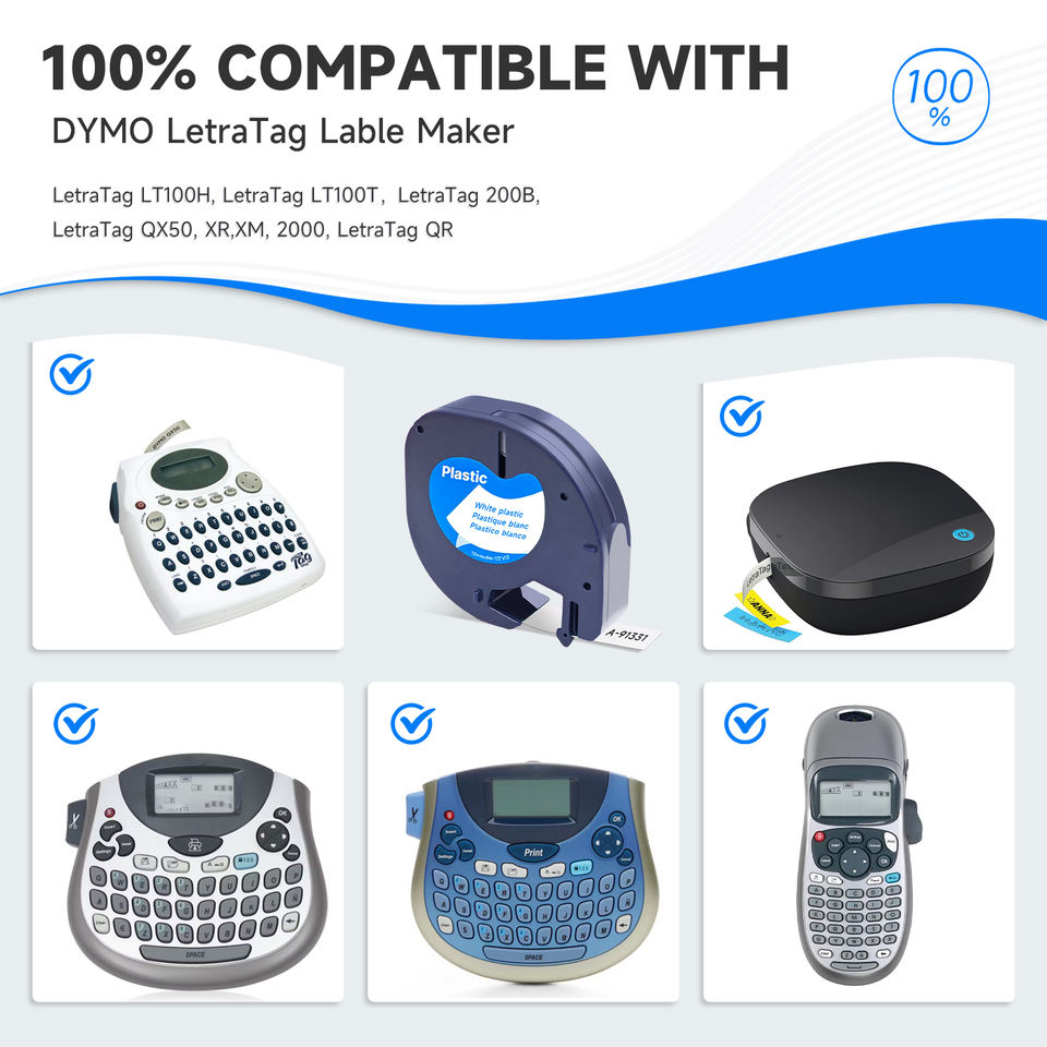 Rubans d'étiquetage en plastique compatibles DYMO LetraTag 91331, noir sur blanc, ruban d'étiquetage LT, 1/2 pouce x 13 pieds pour imprimantes 100H
