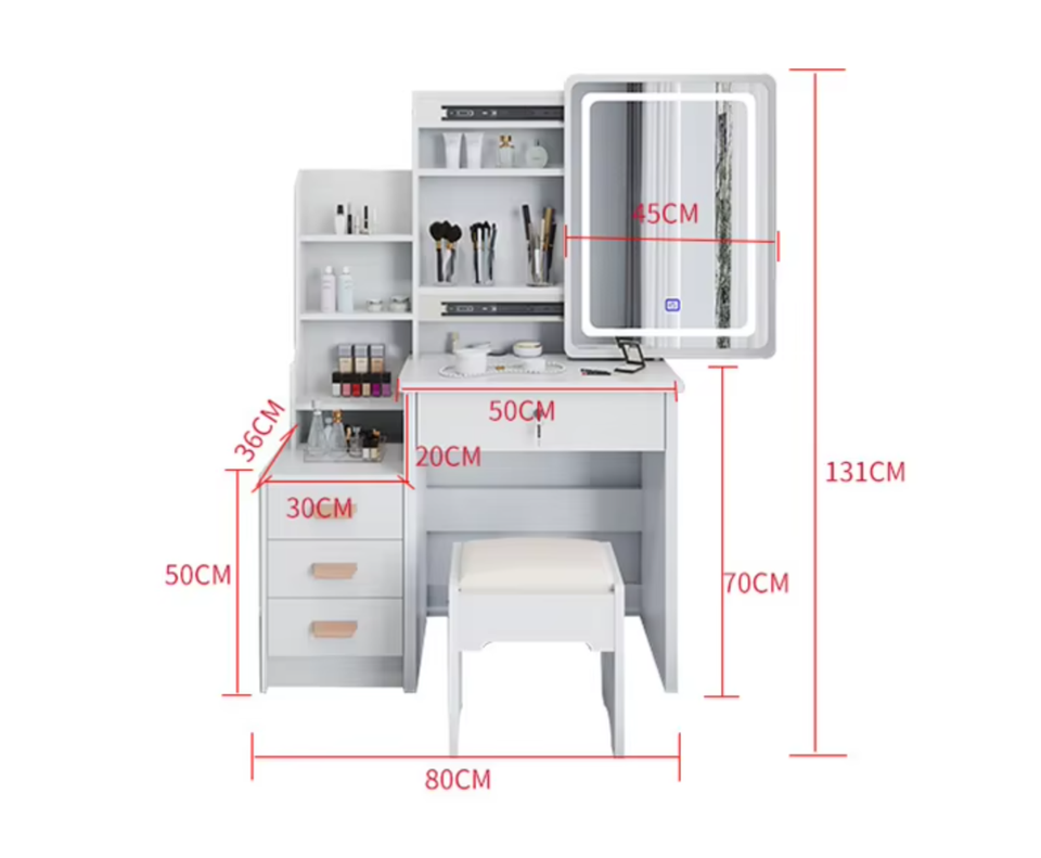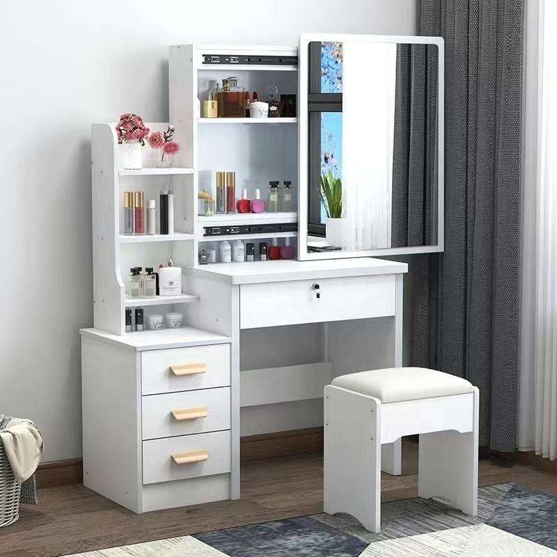 Ensemble complet de coiffeuse de chambre avec armoire de rangement, assemblage en une seule pièce, comprend un miroir et des compartiments de rangement organisés