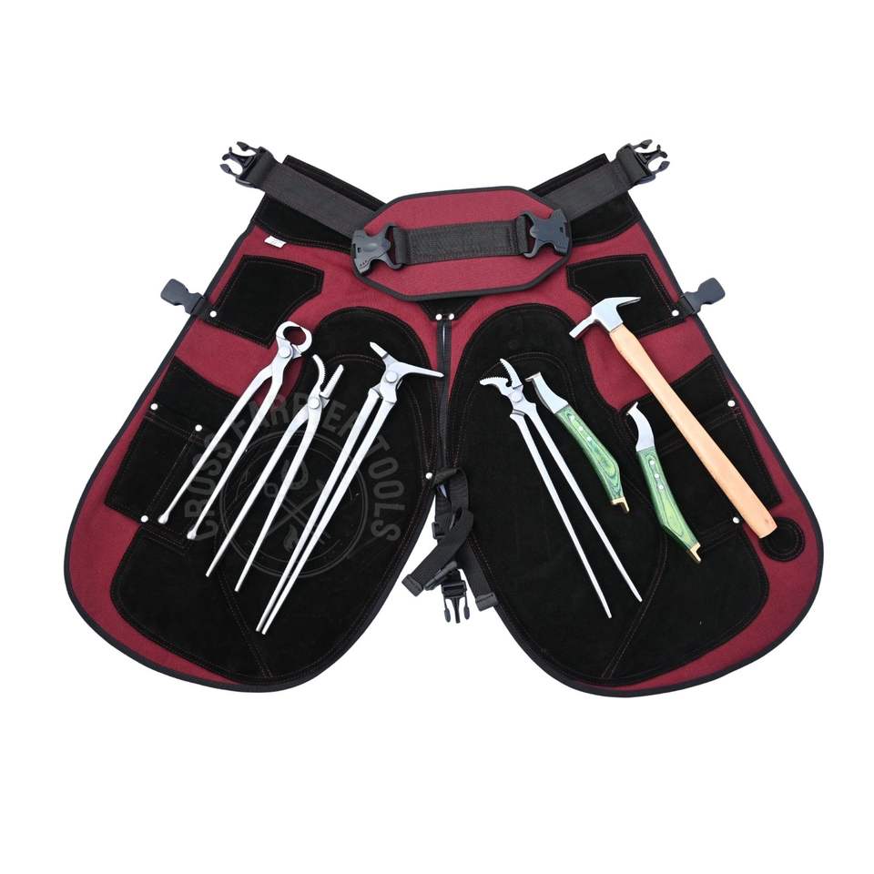 Kit complet de ferronnier avec extracteur de sabots, marteau de ferronnier, tablier de sécurité, couteau à sabots, boucle de coupe, écarteur de sabots et crochets de sabots
