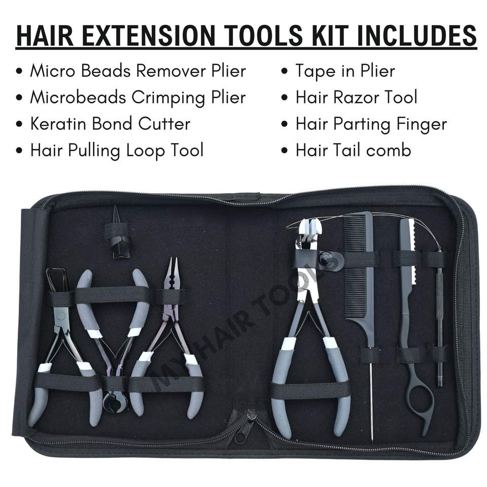 Kit complet d'outils pour extensions capillaires noir avec pince à micro-perles, pince à sertir, rasoir à cheveux et outil de séparation à boucle de doigt