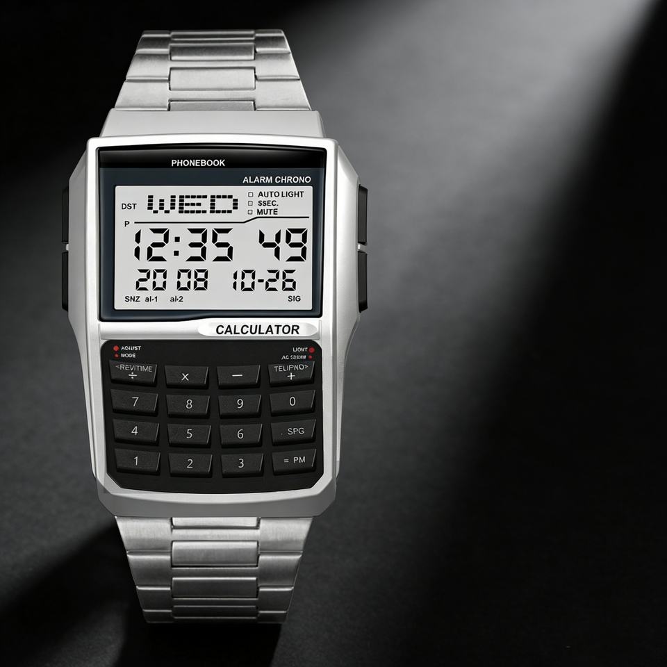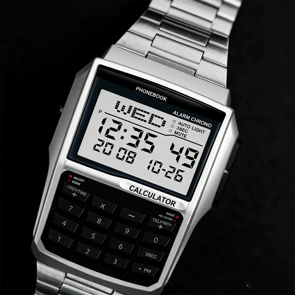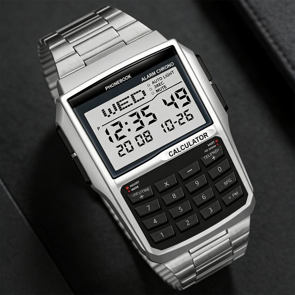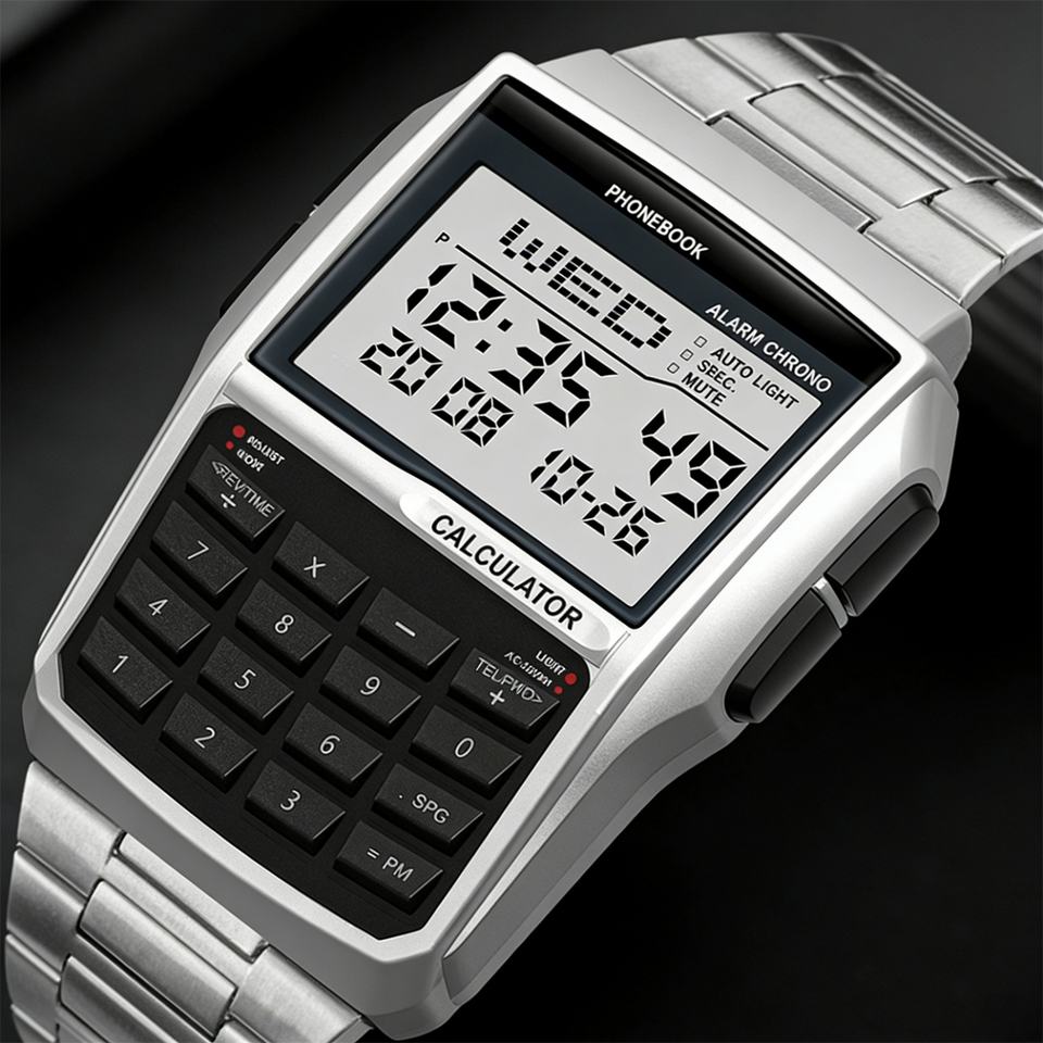 Montre électronique pour homme, style calculatrice, bracelet en alliage d'acier inoxydable, boîtier en plastique, montre pour étudiants et professionnels