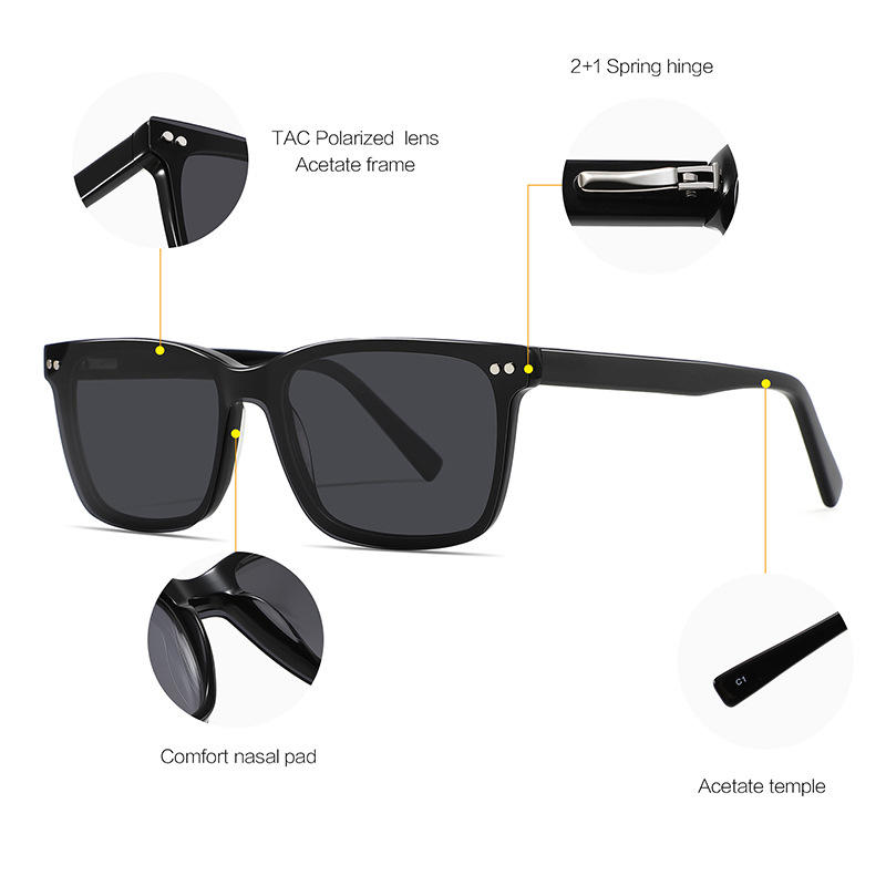Conchen Square Sunglasses Black Acetate Frame UV400 Polarized TAC Lens Unisex Sun Protection Fashion Travel Driving