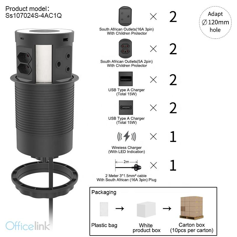 Configuration:6 débouchés sud-Africain + 4 USB chargeur 30W + 1 Sans Fil chargeur + 2M Cordon