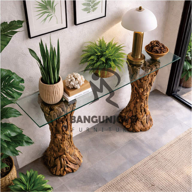 Table console en teck massif avec verre transparent, design moderne, durable pour la maison, les hôtels, les villas