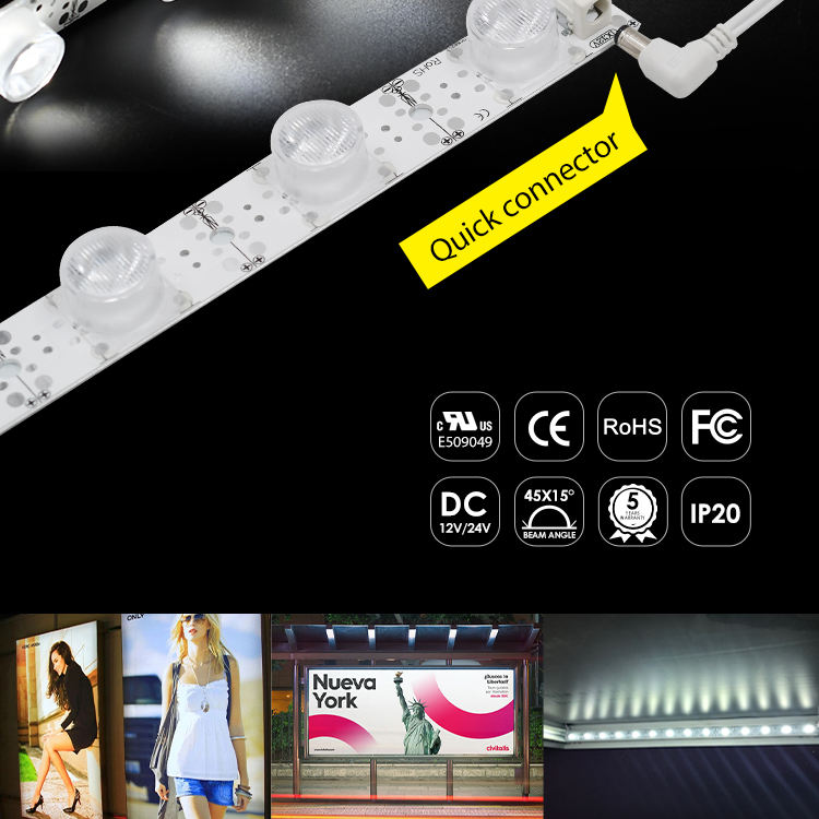 Barre LED à courant constant Edgelight 28,8W DC24V IP20 18LED/m 45×15 ° pour caissons lumineux double face de 80-250 mm